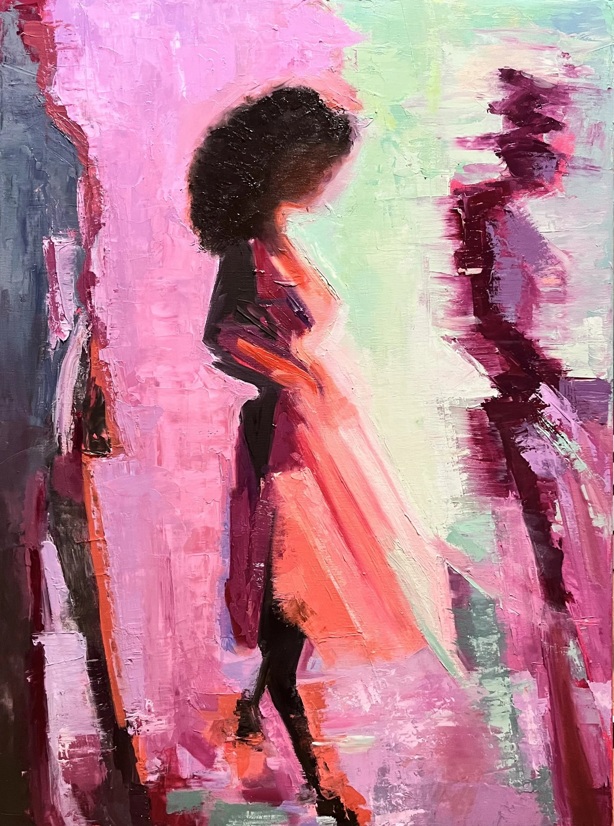 A woman crosses the canvas in mid-motion. Her dress opens into a vibrant trail, and the background—caught between pinks and cool greens—seems to give way as she passes, as if the space briefly comes undone.