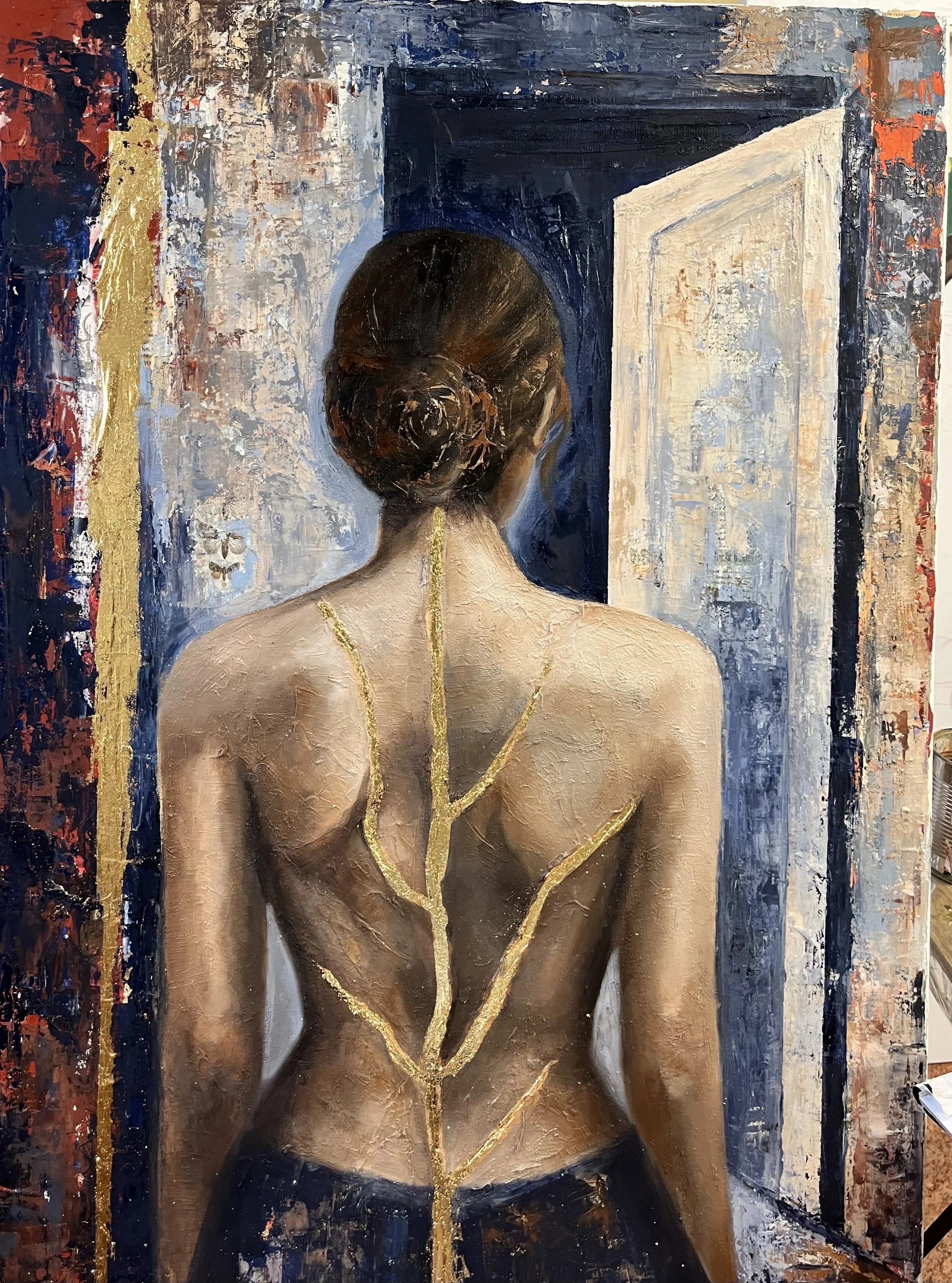 A figure at the edge of change—carrying history forward, facing uncertainty. This painting lives in the suspended space between a past that’s gone and a future you can’t yet see.